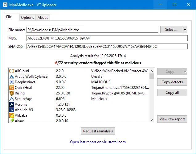 Утилита для загрузки исполняемых файлов на сервис VirusTotal и получения отчётов об их анализе множеством антивирусных движков.