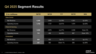 Подразделение ЦОД AMD, которое поставляет CPU и ИИ-ускорители, принесло рекордную выручку в $5,38 млрд (рост — 39 %), что выше прогноза аналитиков в $4,97 млрд (по данным finance.yahoo.com) благодаря высокому спросу на процессоры AMD EPYC и продолжающемуся наращиванию поставок ускорителей AMD Instinct. Операционная прибыль подразделения составила $1,75 млрд, что значительно выше показателя годом ранее в размере $1,07 млрд. За весь 2025 год выручка сегмента ЦОД достигла рекордных $16,6 млрд, что на 32 % больше, чем годом ранее.