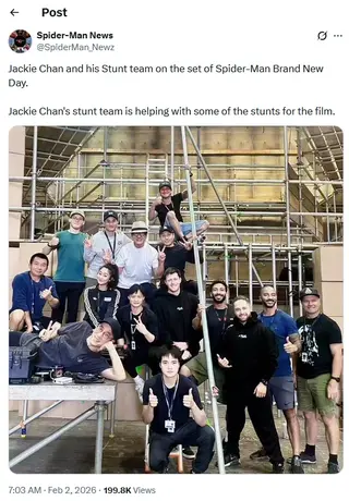 Опубликованное в Twitter аккаунтом Spider-Man News фото показывает Чана — легенду экшена и мастера боевых искусств, известного по фильмам Пьяный мастер (1978), Полицейская история (1985), Разборка в Бронксе (1995) и многим другим — вместе с его каскадёрской командой на съёмочной площадке Brand New Day. Команда каскадёров Чана также работала с Креттоном над Шан-Чи и легендой десяти колец, так что фанаты Marvel могут ожидать по-настоящему зрелищные экшен-сцены в грядущем фильме.